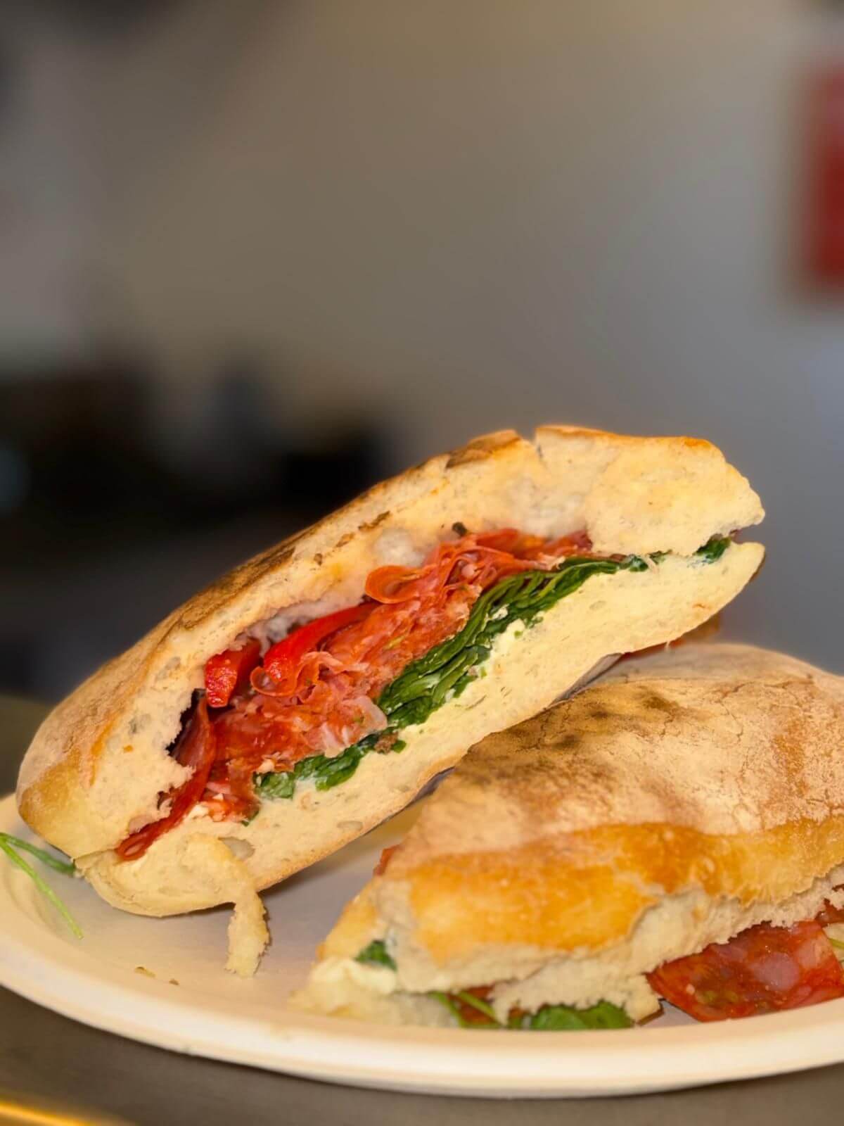 Ingrediente: Ciabatta, Cremă de brânză, Rucola, Ardei copți, Ulei de măsline, Sare iodată, Piper negru măcinat, Salam ventricina picant